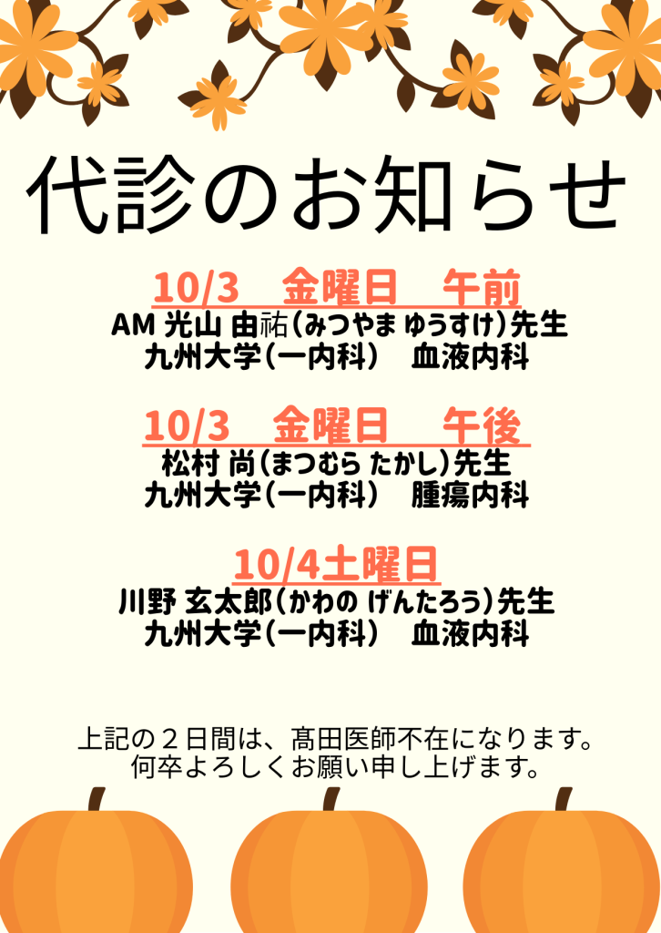 10月3・4日の代診についてのお知らせ